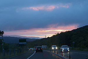 やがて急速に山が色を失って,風が冷たくなった。再び高速道路を走り出すと,行く手の空が夕焼けした。