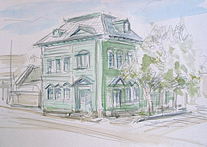 元町の電車通りにある緑色の洋館。2年前,そのスケッチに失敗した。思えば今のスランプはあのときに始まった気がするのだ。彩色に入ってからミスに気づき,坂の角度を修正しようとあがいた時の感触を今でも思い出す。同じ構図でリベンジしなければ,その呪縛から逃れることができない気がして,この旅行中,手を慣らしながら準備してきた。