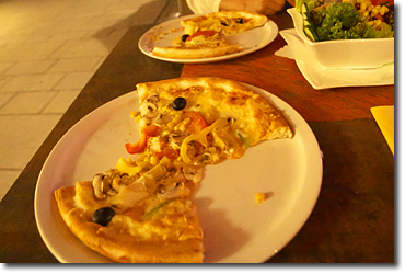 二人で1枚のピザを注文したらこうやって運ばれて来た。鮮やかな気配り,チップ25%級である。ボクらはそれぞれ感激と感謝を口にした。すると若いウェイターは調子に乗ってうやうやしく腰を屈めながら言った。