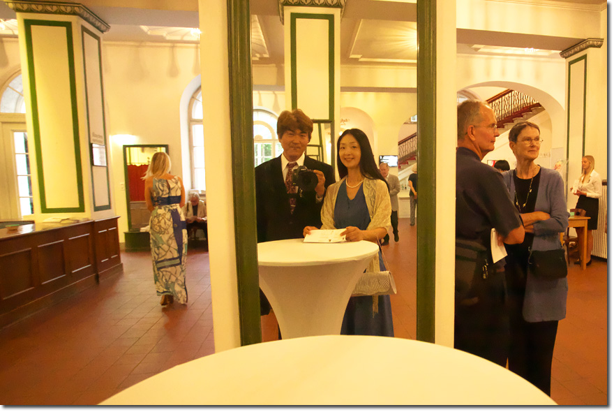 入場してまず行ったのは中庭。聴衆たちがビュッフェのワインを楽しんでいる。この写真,どういう場所から撮っているかと言うと…