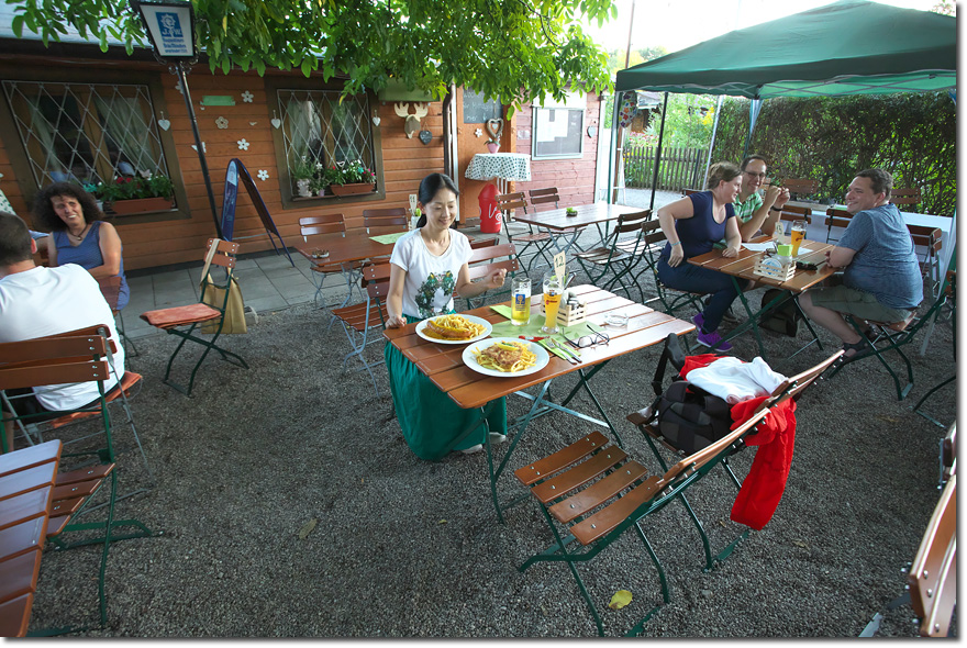 運ばれてきたのは赤ソーセージのカレーソースと普通のシュニッツェルだったが,奥さんの腕は確かだった。