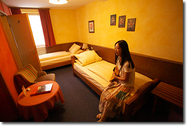 宮殿の扉のように大きなドアを開けて部屋に入ると,古いながら掃除も行き届きシャワー設備も新しかった。ただ…このベッドの角度はどうだろう(笑)