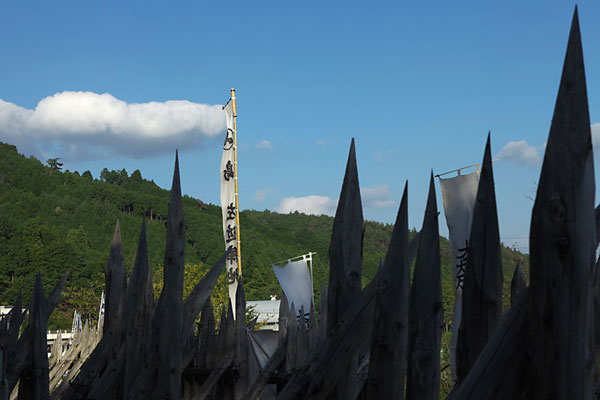 向かって左が東軍,右が西軍の最前線,天満山の麓に小西行長陣跡の幟が見えます。