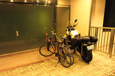 土砂降りの中,ホテルに着く。ボクらの行動は速い。ドレミが準備しておいたお泊り用のかばんを持ってフロントに走る。ボクがルーフから下ろした自転車をドレミにパスするとそれを引いて駐輪場に走っていく。二台目を取りに来たときには駐車場の案内地図をもらってきている。