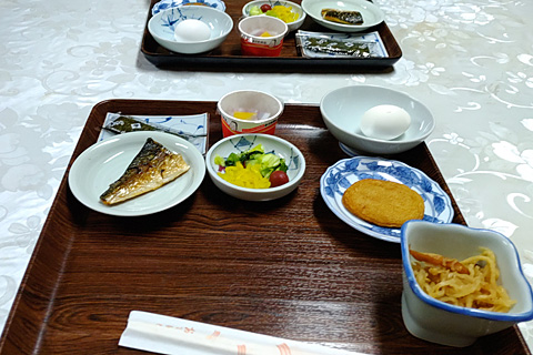 しまなみ旅館の普通の朝食。お魚はちょっと…。一週間くらいギブアップ。
