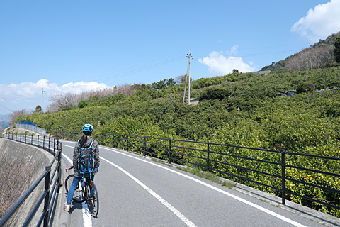 わかりませんと男は答えた。彼の少年時代には蜜柑は栽培していなかったと言う。不在の間に故郷は製塩と米作りの島から果樹栽培の村に変わっていた。もちろん橋を渡って日本中,世界中から来たサイクリストが家の前を通るようになるとは想像もしていなかったろう。隣家の栽培している果樹の名前がわからないと言うことは近隣との交流もない。世代変わりして知り合いもいない。彼の一人暮らしが想像される。ブランドもののスポーツウエアに真っ白なテニスシューズを身に着けて散歩に出ている。ボクたちとの会話では,伊予弁でも大阪弁でもない流暢な標準語で穏やかに話す。大阪の大企業で高いポストにいたことは想像に難くない。彼が故郷に溶け込んで暮らす日は来るだろうか。