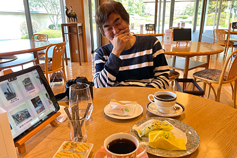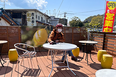 さて,ドレミお待ちかねのカフェは意外にも欧州型だった。生口島スペシャルのレモンケーキはお土産用の棚から個包装のまま運ばれてきた。さすがにドレミに掛けることばがなく,苦笑いするボク。