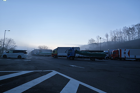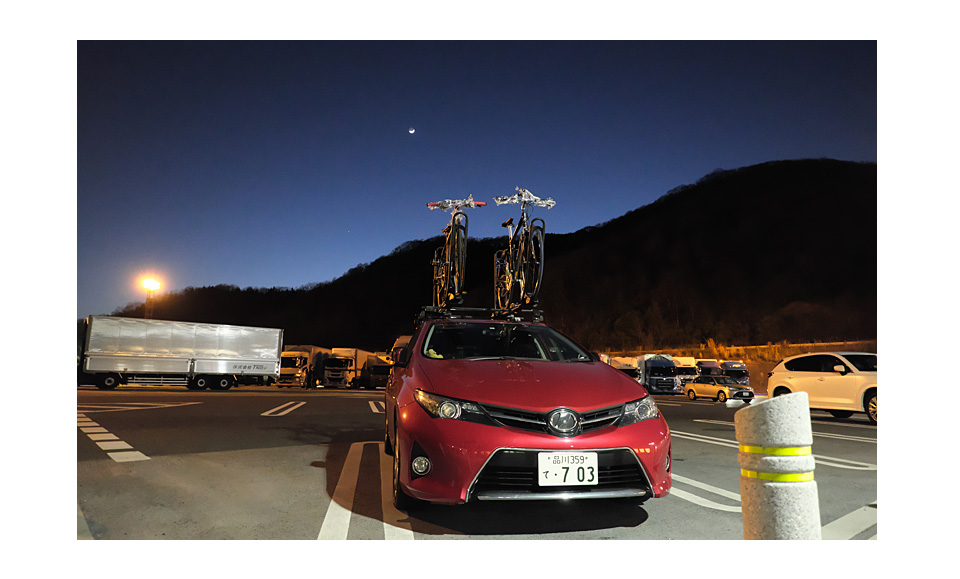 山陽道に美しい三日月が沈む。シャワー施設に行ったが,夕方はトラッカーに人気の時間帯らしく男湯は順番待ちが長い。ドレミだけ行かせてボクは仮眠した。