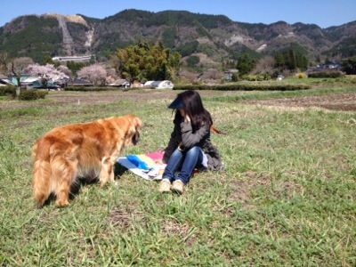 満開の桜も根子岳を臨む雄大な風景も二人…いや二人と一匹占め.