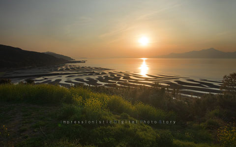 ここは宇土半島御輿来海岸,夕日に染まる三日月形の干潟で有名な撮影スポット.一度見たいと思いながら,通りかかる時間がいつも合わずにいた.この日も干潮時刻が夕日よりずいぶんと早いので,絶好日とは言い難いが,如何せん遠方である.この機会を逃すと,またいつになるかわからないので,阿蘇から激走して,何とか夕日に間に合わせた.