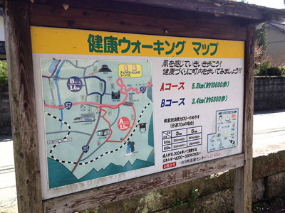 花天井の下でタローに餌をやりながら,ふと植え込みを見ると「健康ウォーキングコース」という村人向けの真新しいイラストマップが立っていた.