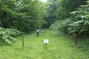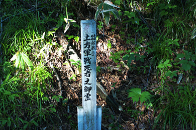 二股川古戦場です。ここの小さな峠をボクたちが登ってきた東側に下れば,五稜郭まで遮るものはありません。数に勝りながらどうしてもこの峠を抜けない官軍は,鈴を使った偽装作戦や様々な陽動作戦を試みますが,鬼神と呼ばれた歳三の指揮する守備隊にことごとくはね返されます。