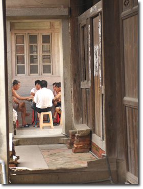 長屋風の門を構えた横丁があった。ボクが中に入りたそうにしたのを洪さんが目ざとく見つけて,長屋の入り口に座っている老人に聞いてくれた。老人は気さくな笑顔でボクにうなずいて見せた。