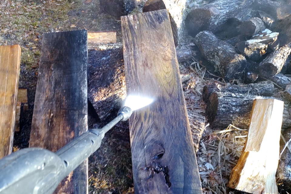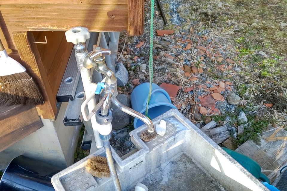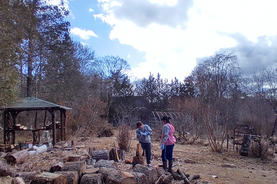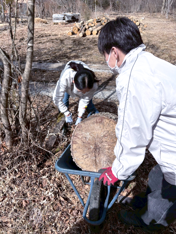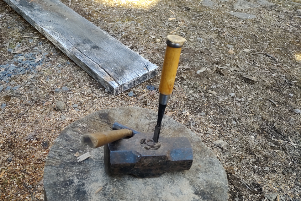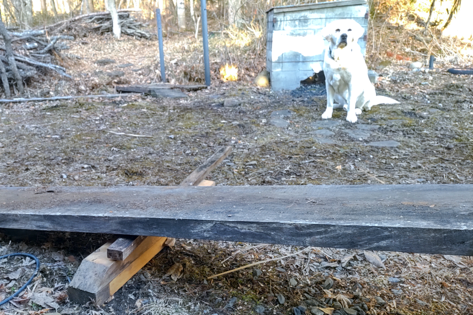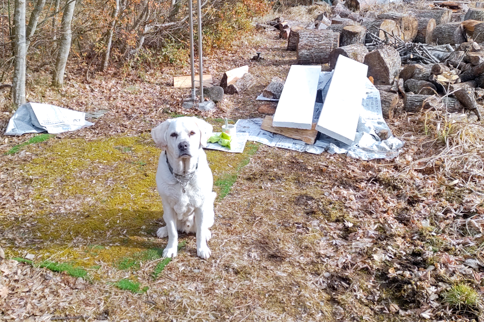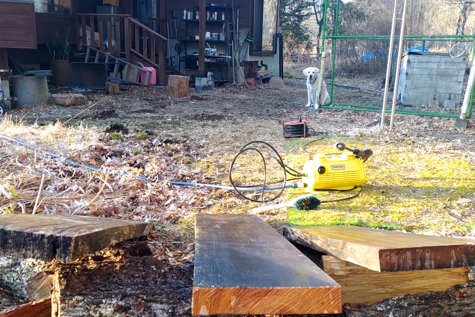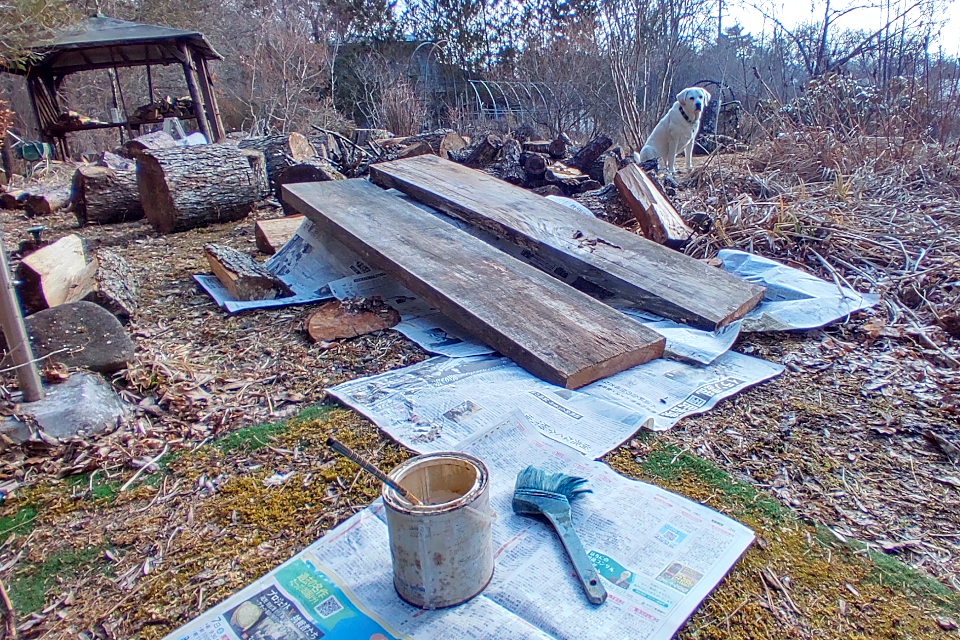 ノミ作業。後方の足場板は駐車場から作業場までなおみと二人でぎりぎり運んできた。今週、水路の橋を架け替える予定。