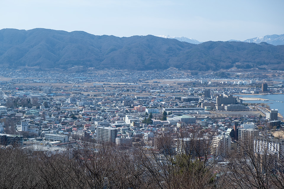 左端に高島城を写した。かつてはここが湖岸だったわけだ。川の堆積物で平地になったのか。それとも埋め立てたのだろうか。