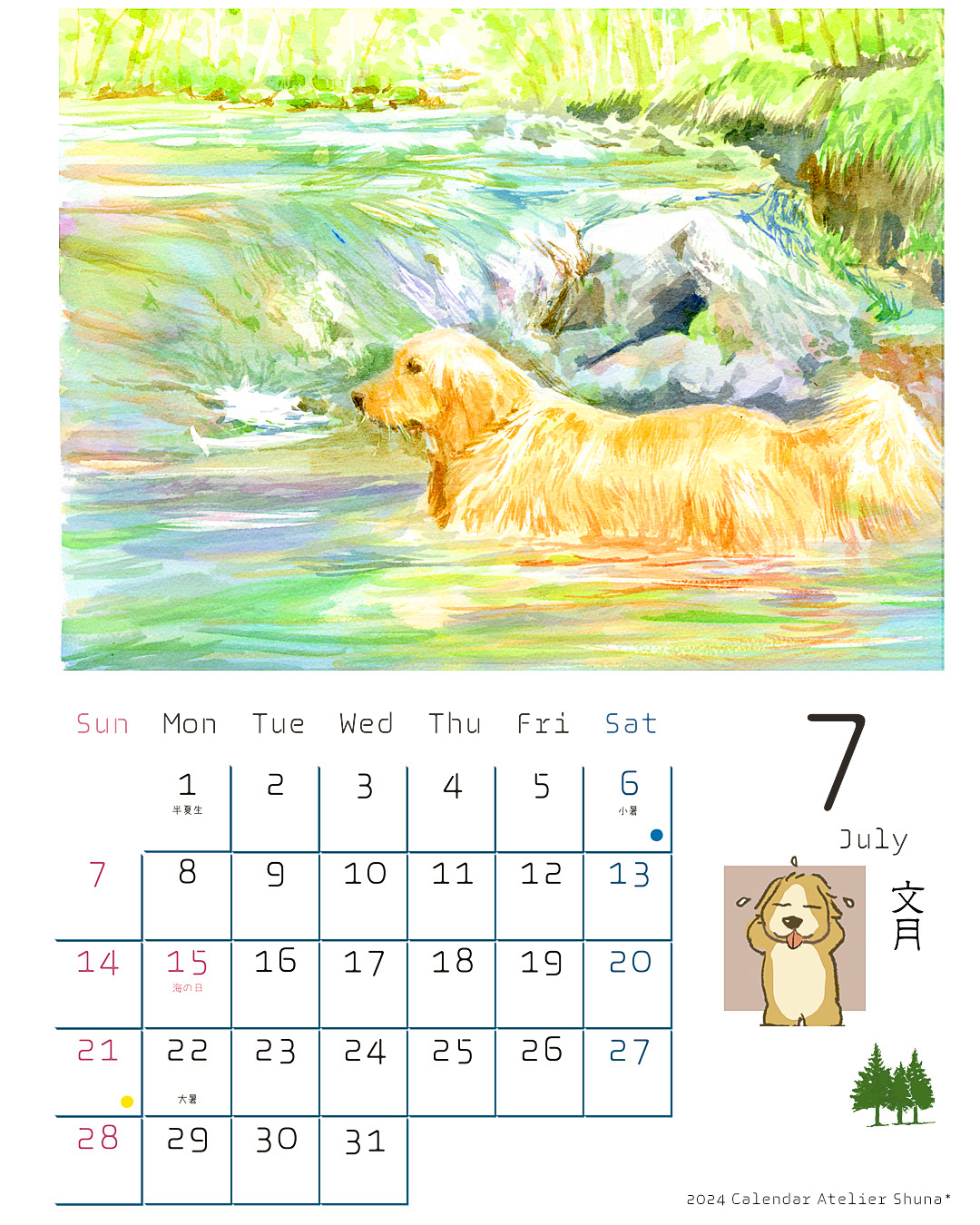 7月のタローカレンダーは秘密の淵です。八ヶ岳のボクたちだけが知っているタロ場(タローが泳げるキレイな川や海のこと)です。夏でも痺れるほど冷たい水が流れていました。