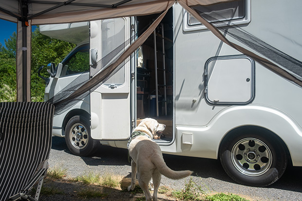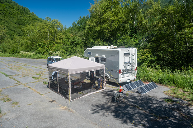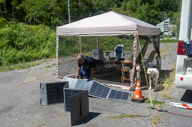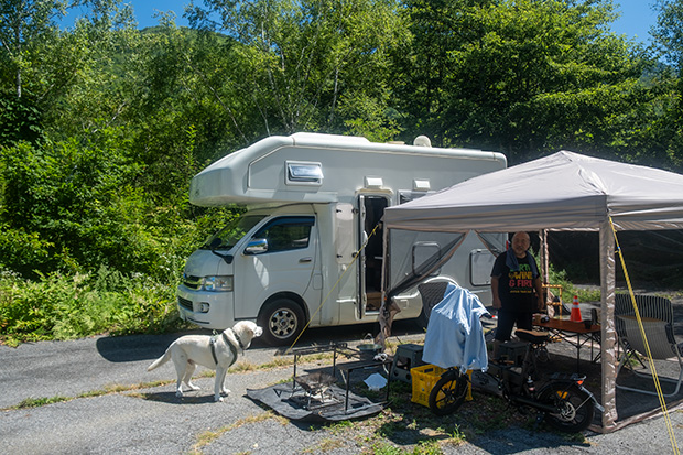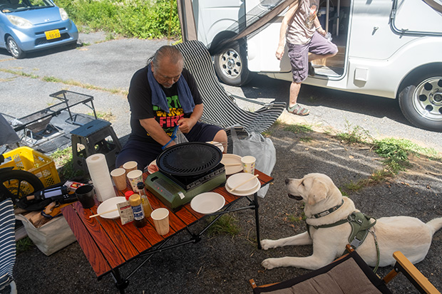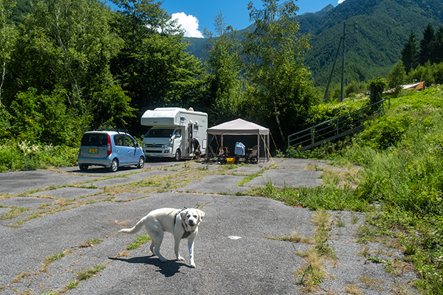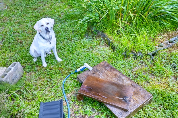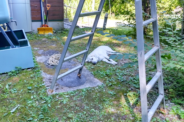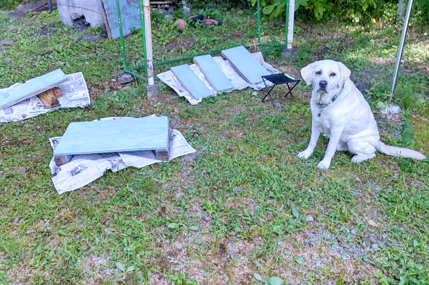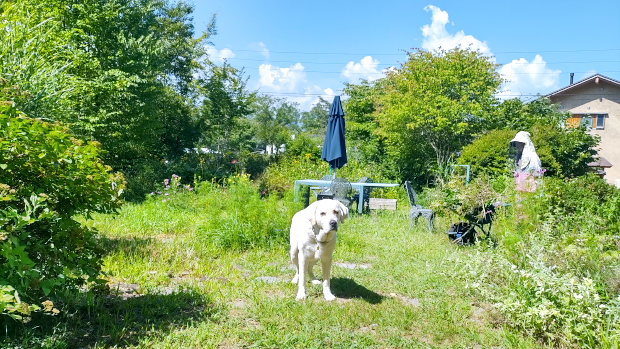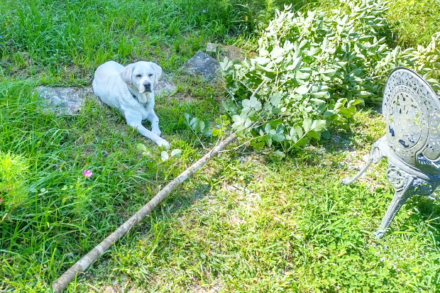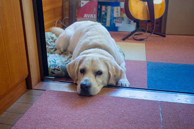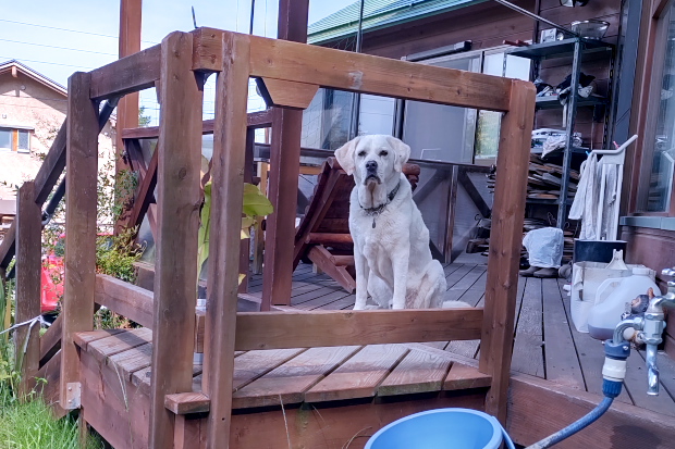 ベランダでステイさせていたが、さすがに不安になったのかいつの間にか近くで死骸化している愛犬。まあ、そっちには間違っても倒れないだろう。