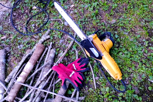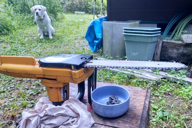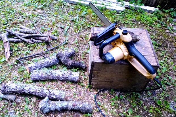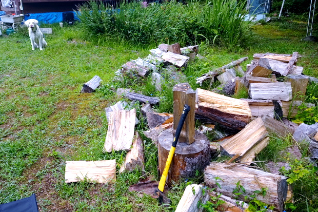 作業場に伐ったウワミズザクラが山を作った。片づけるのに2日はかかりそうだ。