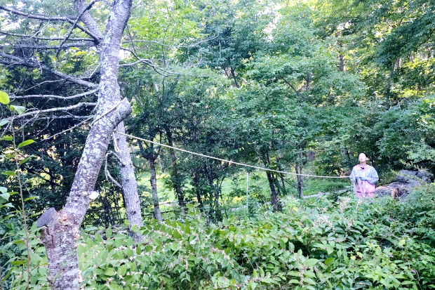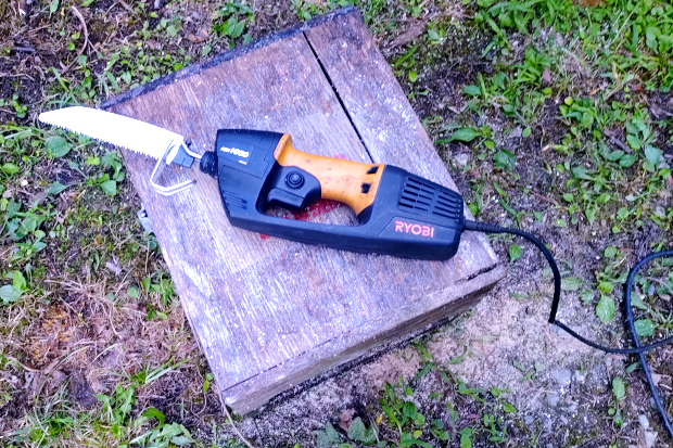 家の方に倒れないよう念のためロープで引きながらチェーンソーを入れた。