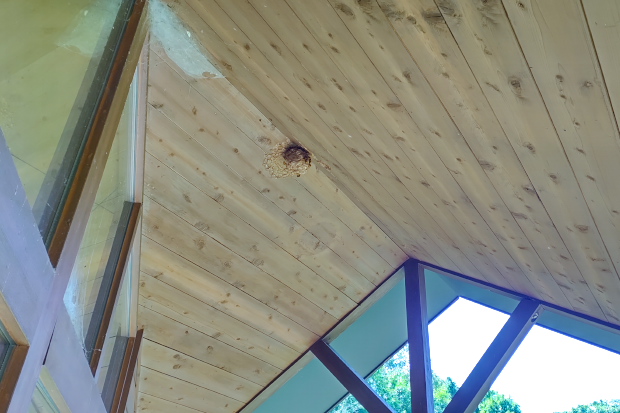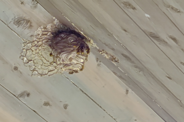 キイロスズメバチのようだ。もう秋である。殺虫剤を使うのはしのびないので冬を待って落とすことにした。2階のベランダに出なければ襲われることもないだろう。
