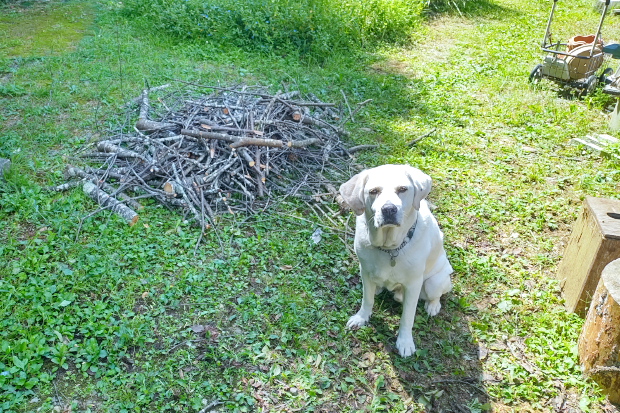 ウワミズザクラの伐採から一夜明けて、午前中からローリィと二人で始末を始めた。この写真を撮ってスマホを置こうとしたところが、