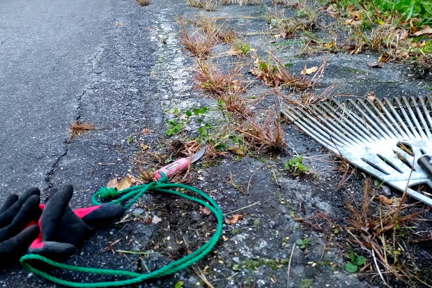 刈払機を持って歩くのはちょっとムリなのでいつも一人でアスファルトの割れ目の雑草取りをする。