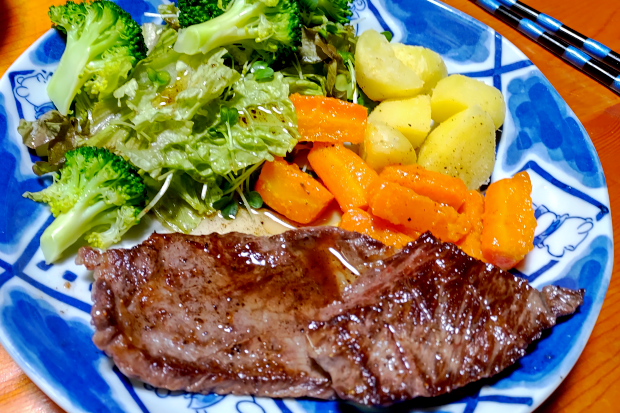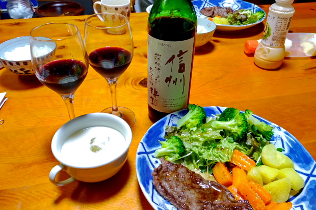 村の地域振興券の期限が今月いっぱいなので、JAで和牛ロースとアルプスワインのスペシャルを買った。