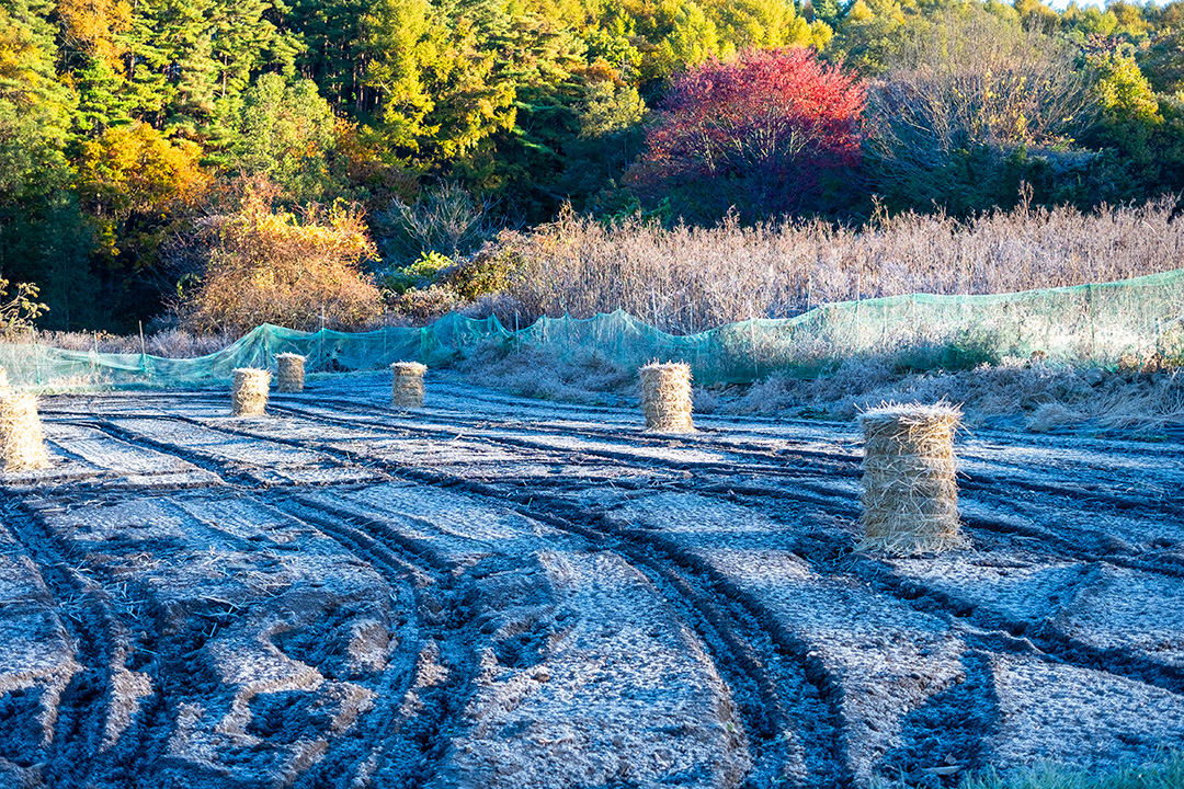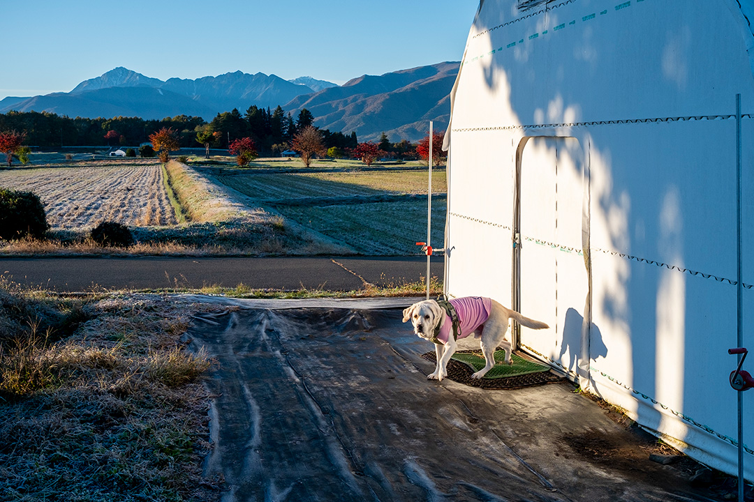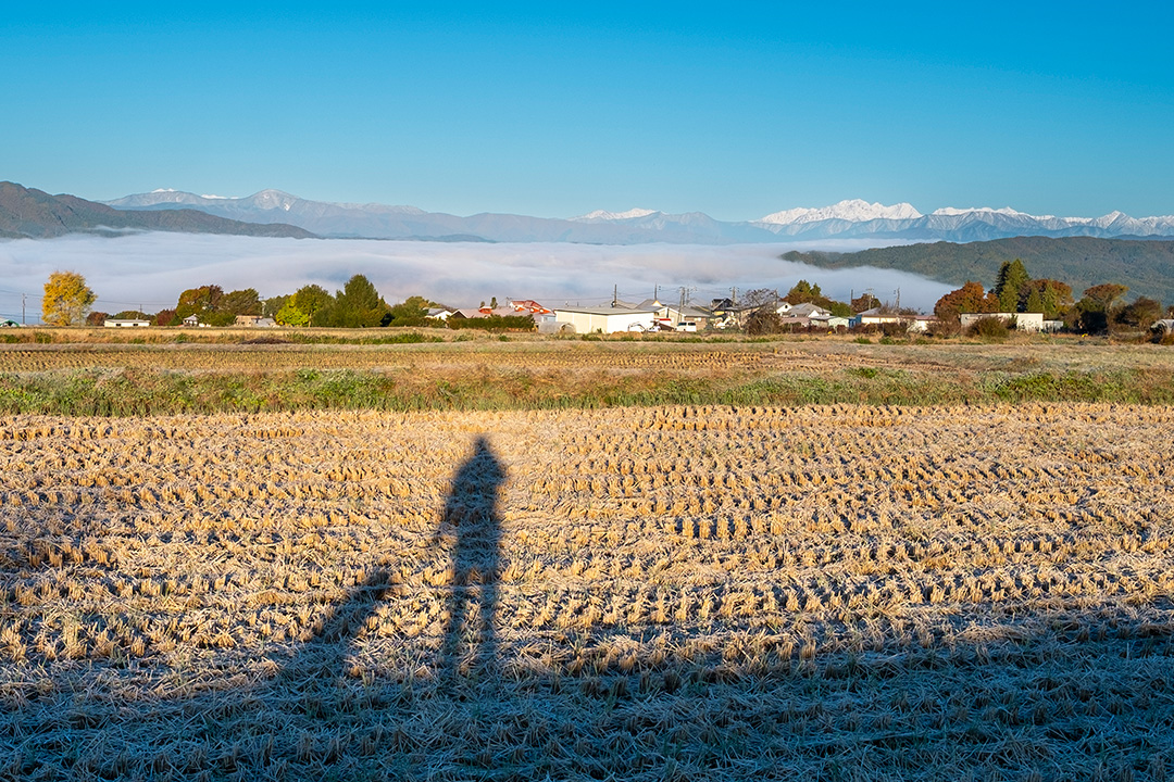 今シーズン4度目氷点下の朝、北アルプスは中腹まで真っ白だ。