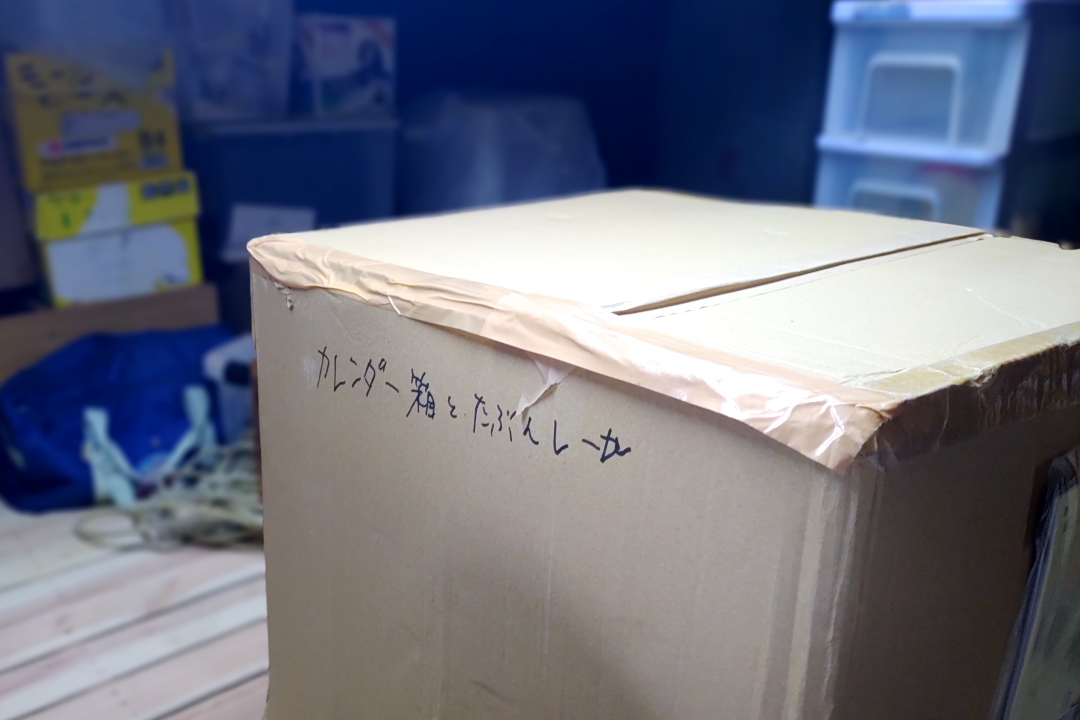 カレンダーの箱とレールを地下室から運ぶ