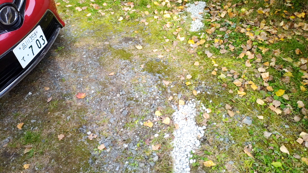 これまでつっかかってキケンだった駐車場の車止めを撤去して穴を砕石で埋める。