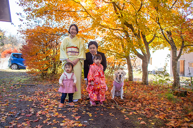 朝、早いうちがいい。集合写真を撮るまでにタイヘンな騒動だった。ゆいちゃんが枝を拾って遊んでいた。けいちゃんは羨ましがってそれを取りあげて遊んだ。着物で棒を持っているのはイマイチなのでお父さんが棒を取り上げたら火の出るように泣き出した。晴れ着のまま尻もちをつく。なんとかご機嫌を取ったがまだ涙目が腫れぼったい。
