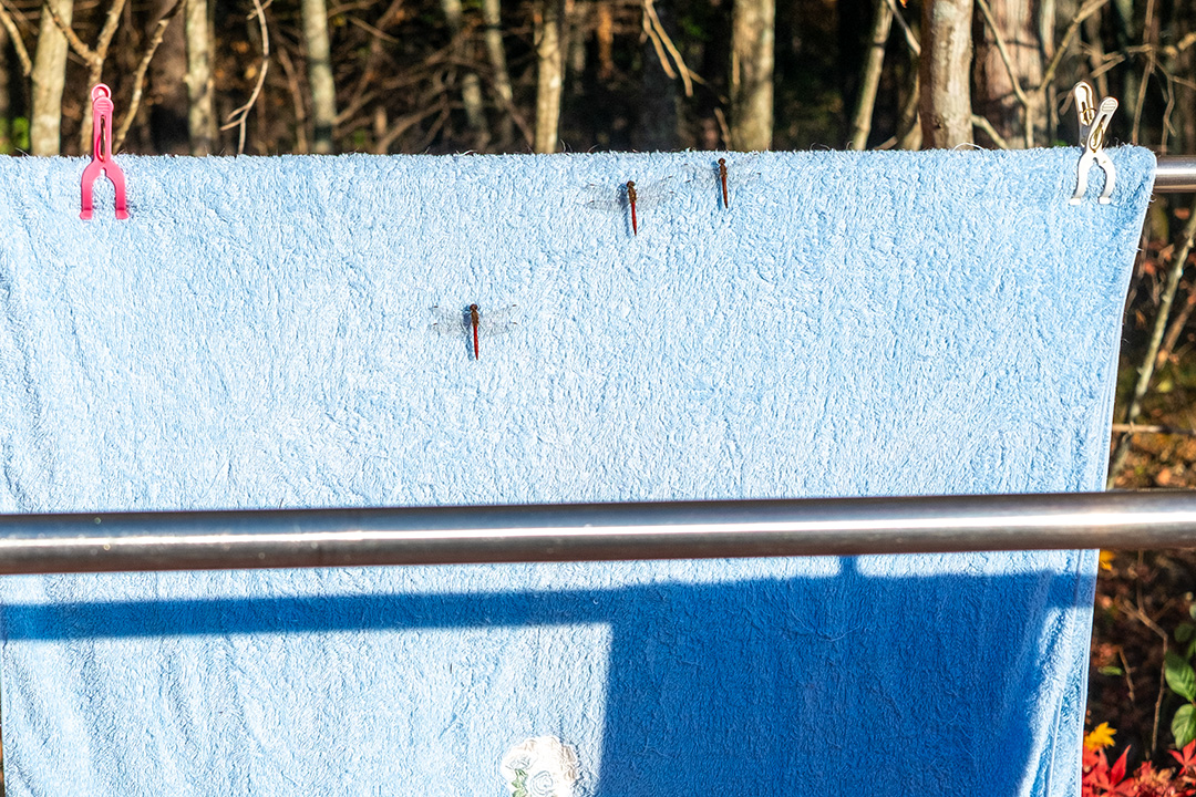 カメラを近づけると逃げてしまったのだが、まるで布の柄のようにびっちりと洗濯物に留まる