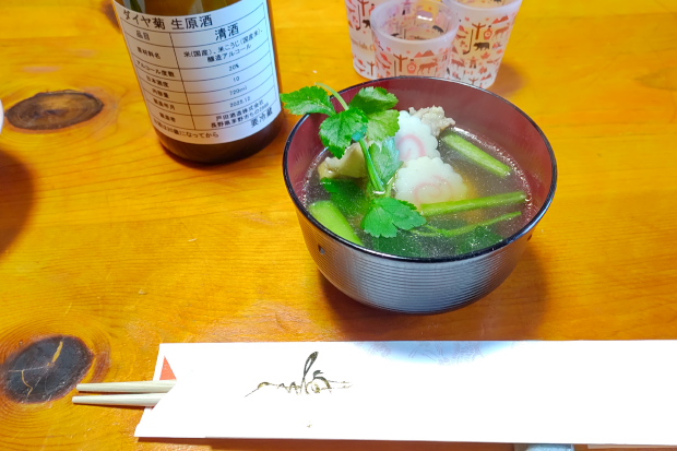 一週間前に揃えておいた具材で雑煮を作る。ミツバは花瓶に生けておいた。お屠蘇代わりはダイヤ菊の生酒