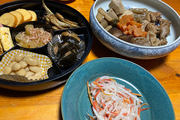 お煮しめとなます。お節の伊達巻や昆布巻きは生協で買ったものの、田つくり代わりにワカサギを揚げた。