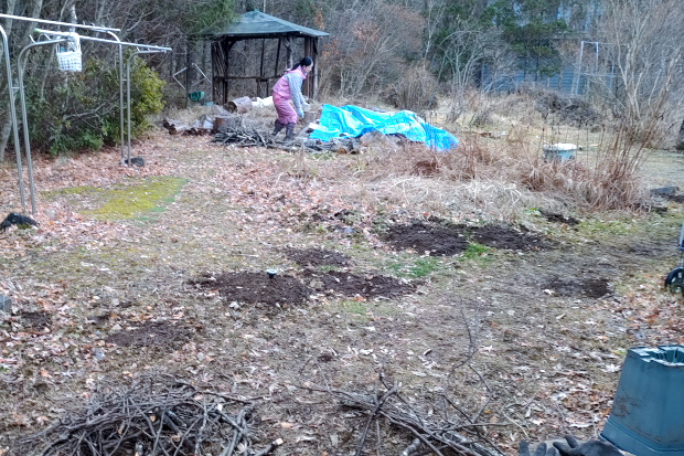 丸太をぬらさないようシートをブルーシートをかけて作業終了