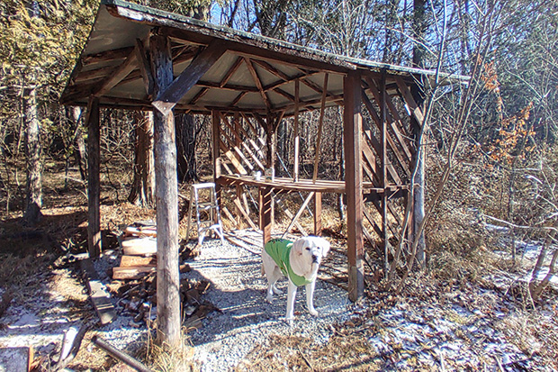 薪割り中。斧をふるうとき、あの位置まで下がるよう一度指示したら二度と近づかない。くさびをハンマーで叩き始めると金属音が耳に響くらしく、自主的にさらに下がる。…が、一声呼べばすっ飛んでくる。もちろんクッキー目当てである。