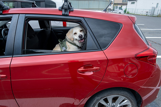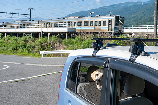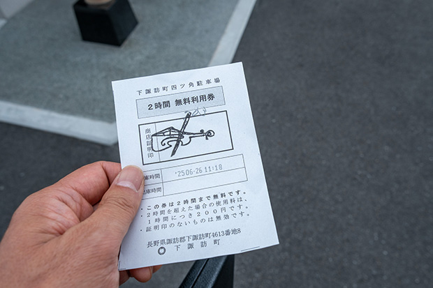 下諏訪着。窓を全開しておけば駐車場で留守番できる。