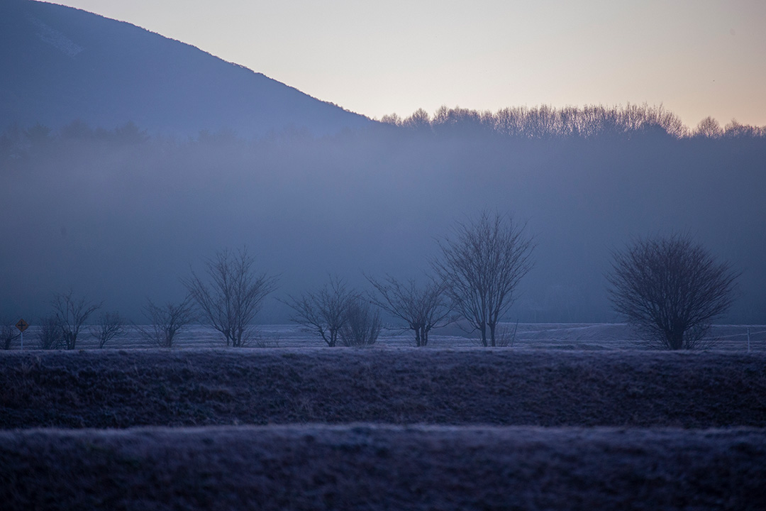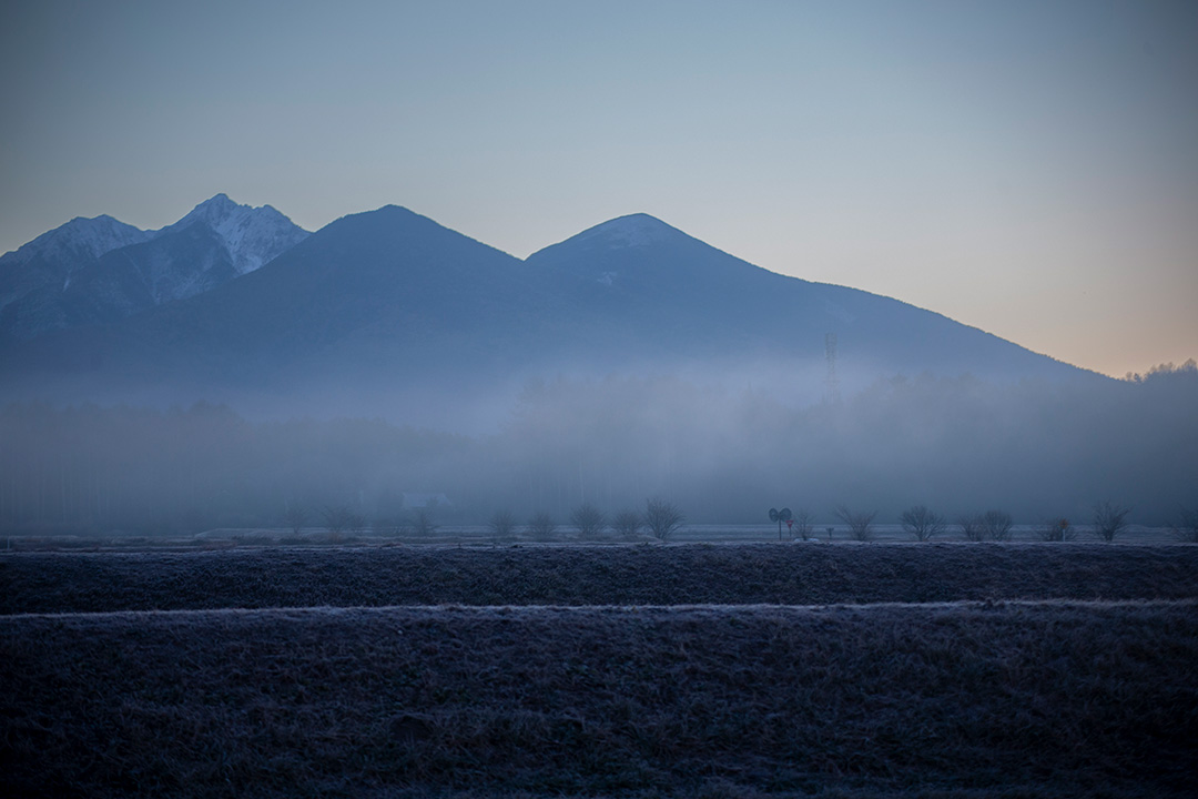東の空が明るくなり、霧の中から八ヶ岳が姿を現す。