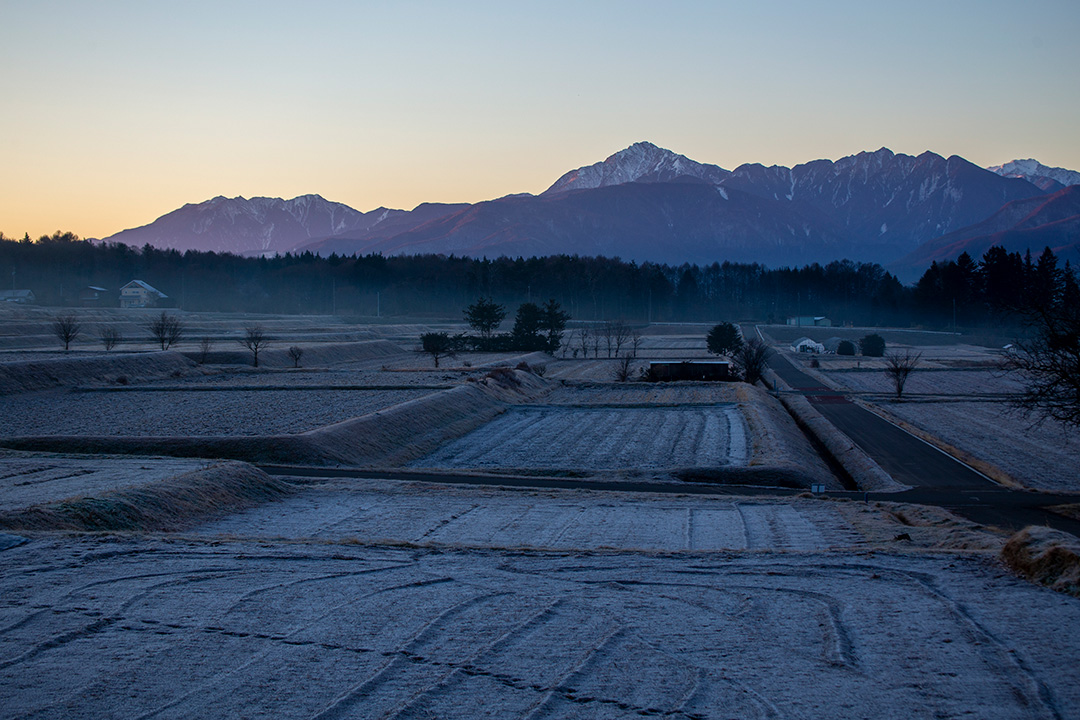 冬至の入日が甲斐駒の頂上に沈む。