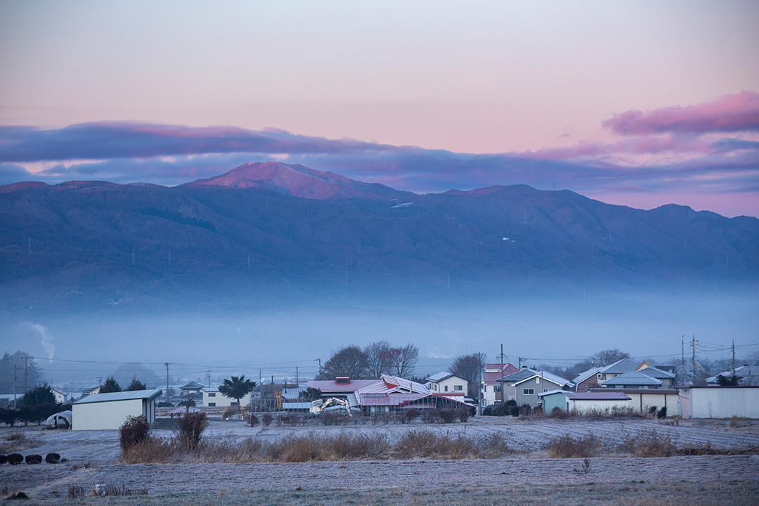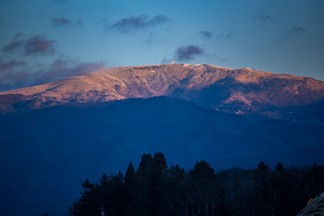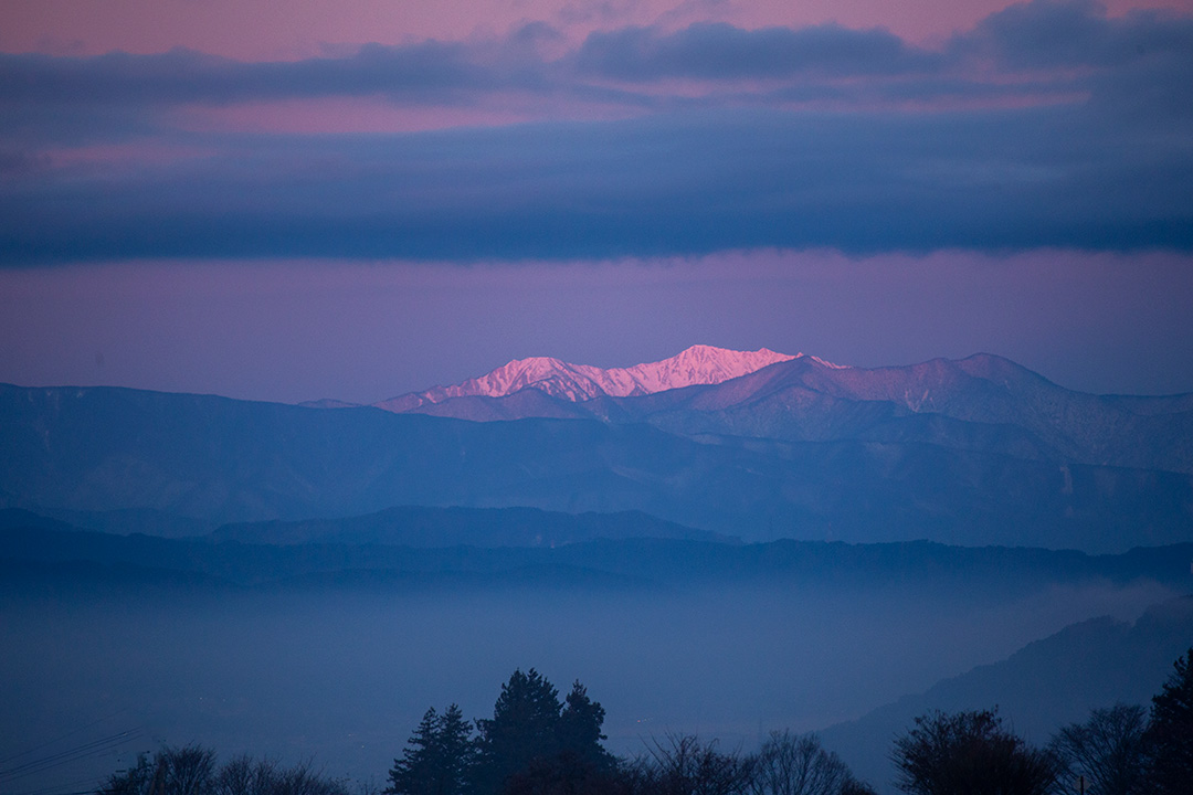 続いて中央アルプスの裾野越しに見える御嶽山の頂が明るくなった。