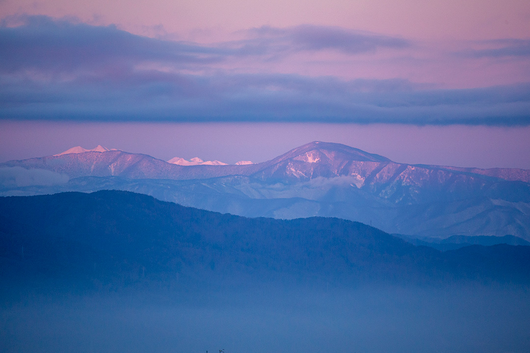 西に振り向くと、最初に乗鞍岳が紅色に染まり始める。
