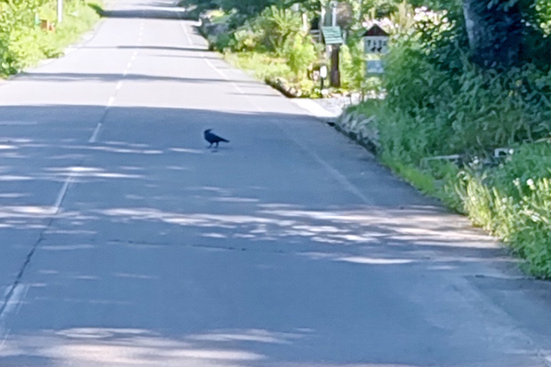 下の道路に毎朝カラスが来て何やらついばんでいる。