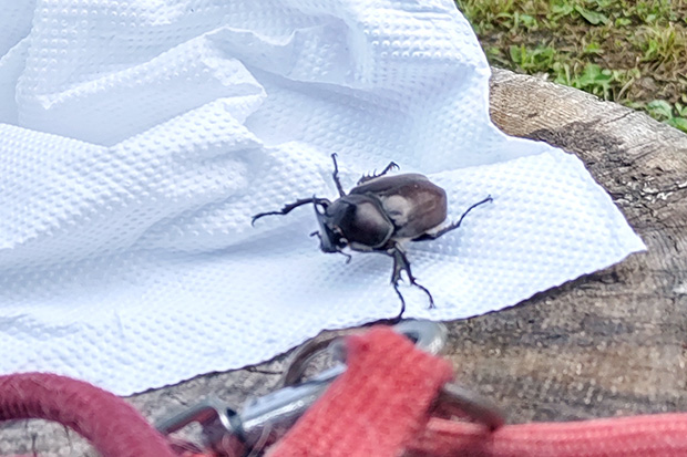 正体はこれ。車やカラスにやられる前に一匹助けてきた。一昔前までウチの標高ではカブトムシはいなかった。