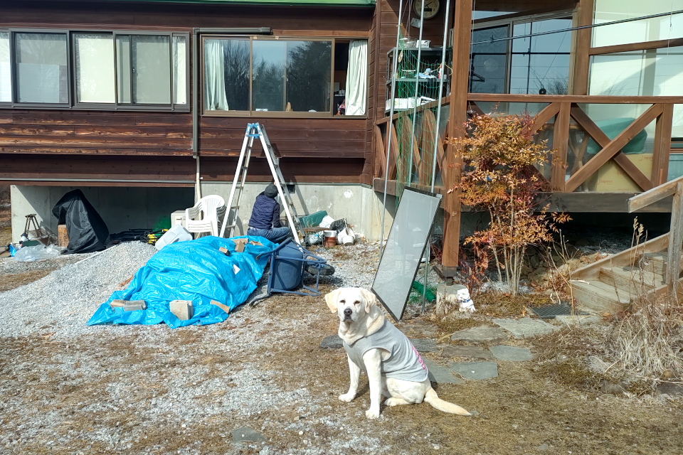 軽トラに積んできた材木をこれも巻き尺でパパパと測りながら切ってつっかえ棒を作ってしまう。そしてまた油圧ジャッキを何度も上げ下げして正確に設置した。サッシの窓や網戸のゆがみをネジでちょちょいと調整すると、全く動かなくなっていたサッシがからりと開閉できるようになった。