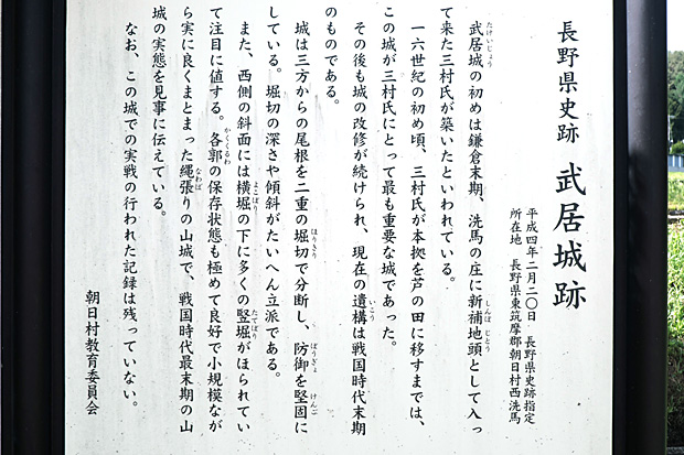 別名洗馬城。朝日村西洗馬にある戦国武将武居氏の居城