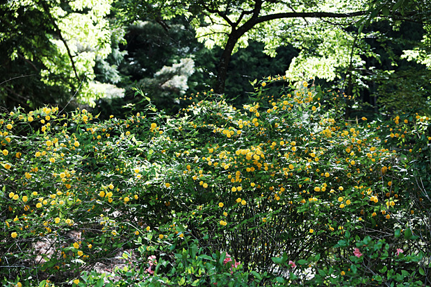 五月晴れの信州朝日村は暑くもなく寒くもなく空気が心地よい。誰が手入れするのかヤマブキや野ばらが路傍を埋めるように咲いている。