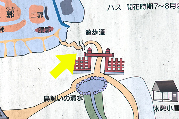 地図の通り、城の飲料水となった「鳥飼いの清水」なる池もある。ここから水を運べるくらいだから城までの勾配も大したことはないようだ。