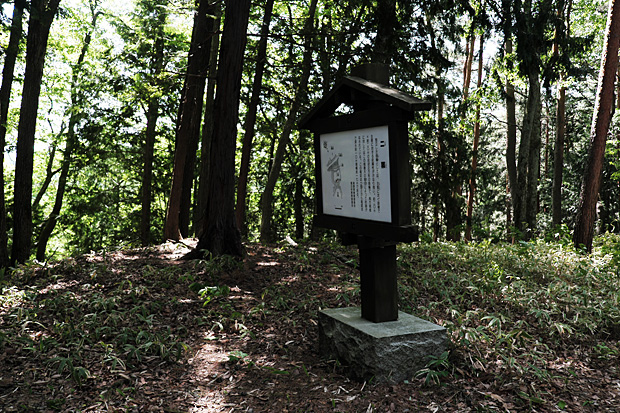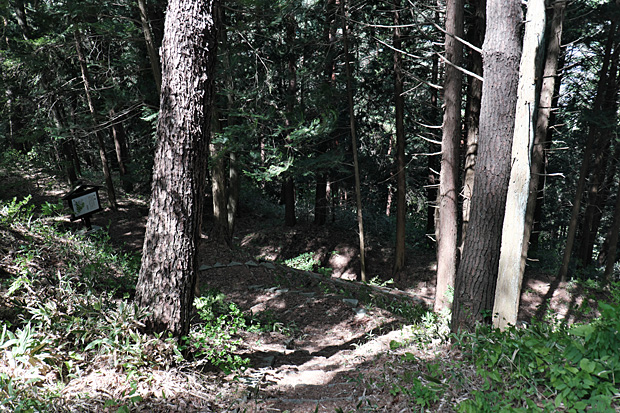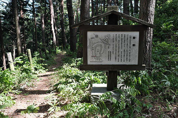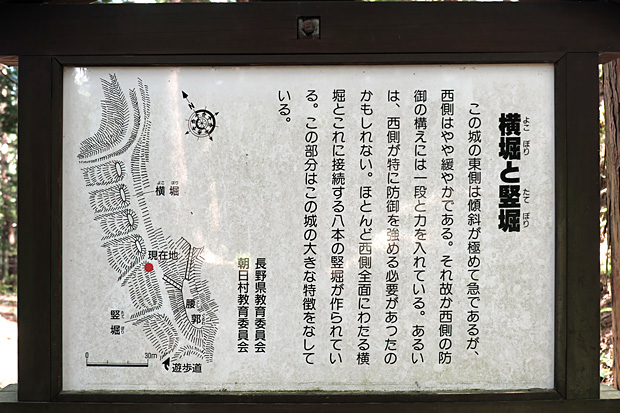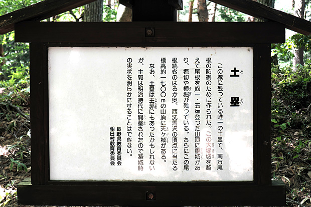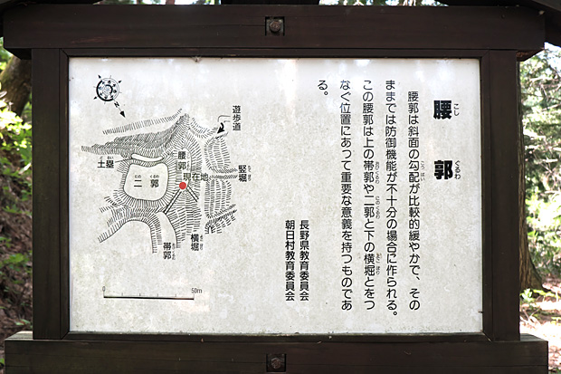 二郭を去るとき案内板がずいぶんと傾いていることに気づき、戻ってみると根元が腐っていた。後ろから子どもの力でトンと突いても倒れそうである。知らずに近づくと危ないので、下山した後、朝日村教育委員会ホームページのメールフォームに報告しておいた。すると後日、丁寧な返信が届いた。