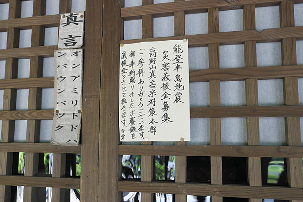 脇に立つ馬の銅像に輝くは笹竜胆紋(源氏の家紋。源頼朝は義仲が使用したことを嫌って白旗無紋としたとの説あり)!!高まる義仲ムード!!お!お堂の正面に何やら真新しい貼り紙。