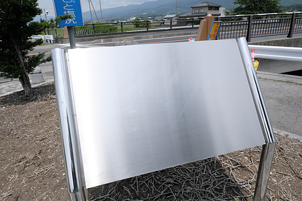 橋の工事に合わせて、たもとにあるバス停がぐっとスペースを広げ、小さな公園を兼用するようになっている。そこに何やら案内板も設置されているので自転車を停めて見に行った。
